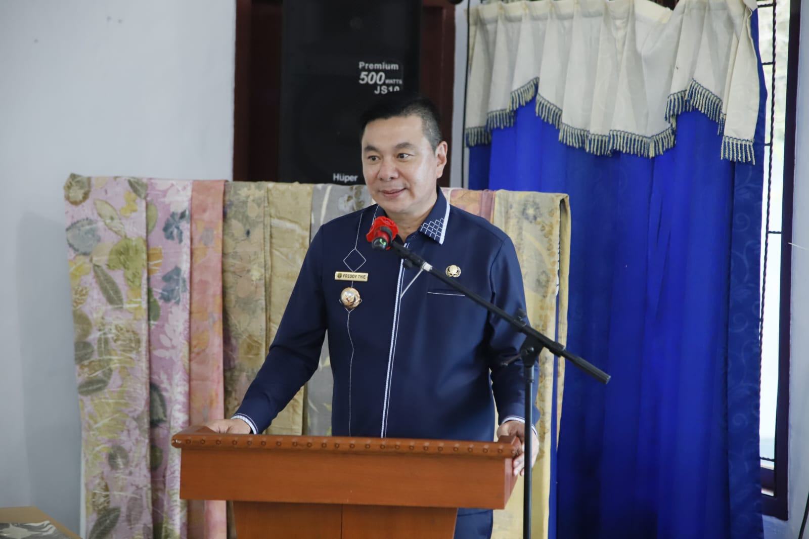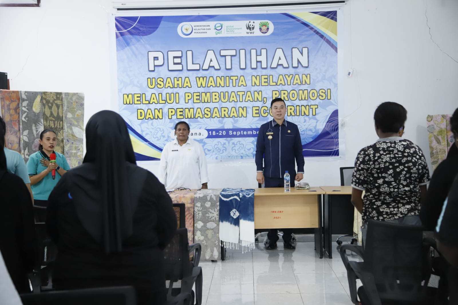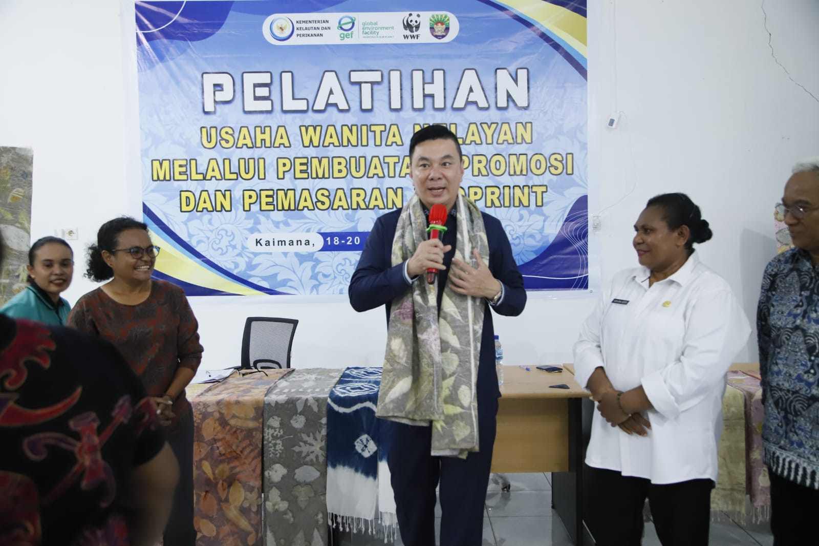 Bupati Kaimana, Freddy Thie, memberikan sambutan dalam acara penutupan “Pelatihan Usaha Wanita Nelayan Melalui Pembuatan, Promosi, dan Pemasaran Ecoprint” yang diselenggarakan oleh Dinas Perikanan Kabupaten Kaimana (20/09). Kegiatan pelatihan ini bertujuan untuk memberdayakan para wanita nelayan melalui inovasi produk berbasis ecoprint sebagai salah satu upaya peningkatan ekonomi masyarakat pesisir.